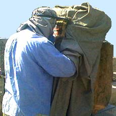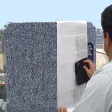 石碑に器具を取付けて、ゴムシートを切り抜いた箇所に圧縮空気で特殊な砂を噴きつけて彫っていきます。(サンドブラスト)